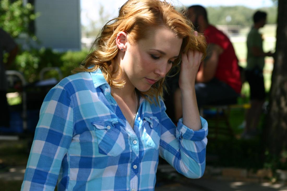 She’s young, pretty, and movie-actress thin — at 23 she can still pass as a high school student. She’s been eating different foods on location and is apparently feeling a little puffy after three weeks of snacking on the chips and deli trays set out for cast and crew.
