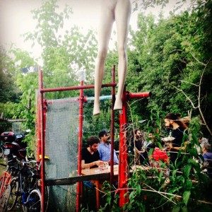 The next day, after some friends prepared a seafood pasta for lunch, I hopped a train to Bologna for a show at Laboratorio L’Isola –– an outdoor house concert in what might easily be mistaken as a squat or a hippie commune. There are six or so permanent residents and several people who come through and stay for varying lengths of time, contributing their artistic or culinary prowess or simple company, and there’s a garden, and a quaint little stage out front surrounded by a wooden fence and overhanging trees. And there’s the bottom half of a female mannequin hanging by the entrance gate complete with pubic hair and one hairy leg.