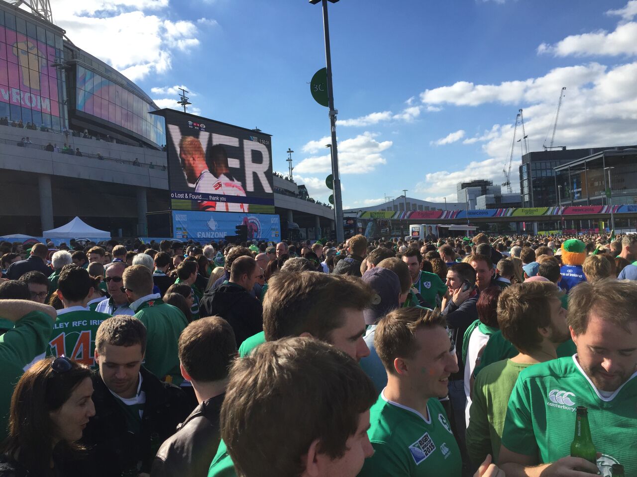 The game I attended (together with the whole of Ireland) came at Wembley Stadium. The facility serves as England’s national association football (soccer) stadium, but it has also have played host to a pair of RWC matches. Even though the crowd had only pockets of yellow-clad Romanian supporters, the game presentation stayed studiously down the middle, as it must during a neutral-site event. The P.A. announcer’s energy level when announcing lineups and tries for both sides would have felt at home at a Mavs game. They play both national anthems before the match and have a large video board for replays.