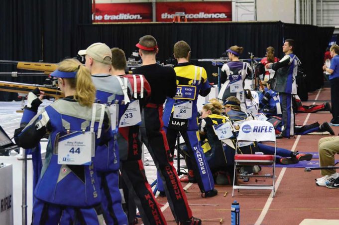 As a two-day competition, each day hosts one event that affords a team 240 shots, worth 10 points per attempt. Rifle has two events: air-rifle, in which each competitor fires a .177 caliber lead pellet from a standing position at 10 meters from his or her target for 60 shots; and smallbore three-position rifle. Each competitor in smallbore fires a .22 caliber bullet from his or her rifle in the standing, kneeling, and prone positions from 50 meters, 20 shots from each position, for a total of 60 shots. A perfect total for each event is a 600, 1,200 per shooter for the match. Teams field shooters who compete for the highest aggregate team total, and shooters compete for the best individual scores. A perfect team total is 4,800; the best four shooters’ scores count towards the total.