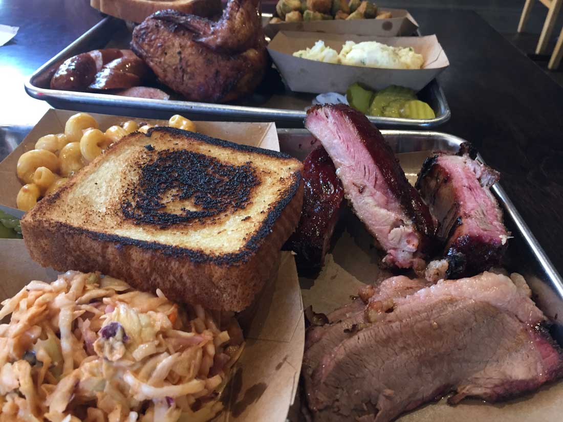 My guest and I each went for the Double Down ($13.99), a combo of two meats and two sides. Each of the butcher-paper-covered metal trays were pouring over with food, including buttery Texas toast, pickles, and an ample supply of fresh onions.