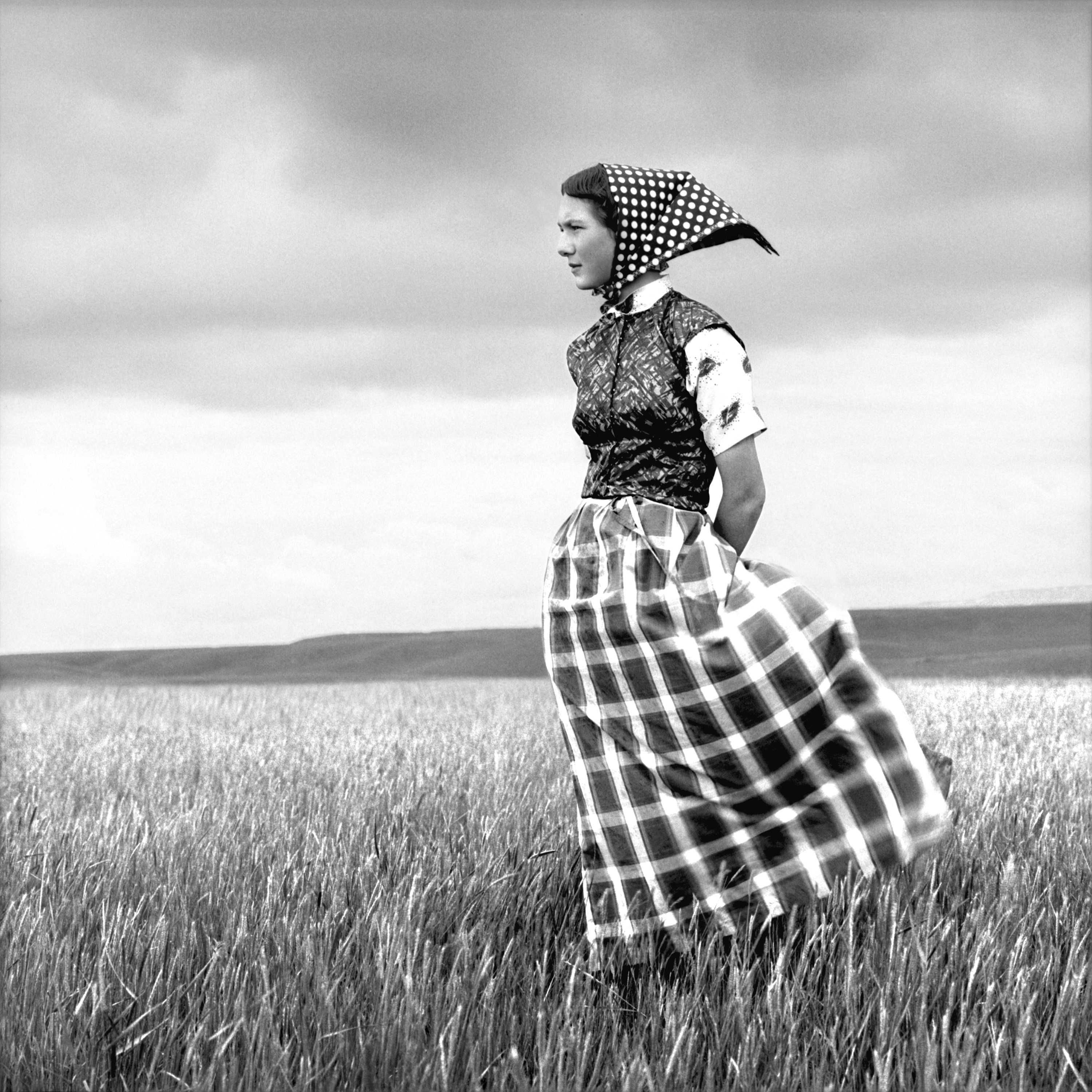 In the “Emma” composition, the subject is as poetic as she is poignant. She stares toward the horizon, facing the wind, unmoved. Her neatly pulled-back hair is tucked in an almost perfectly tied triangular polka-dotted bonnet as the wind blows her simple checkered skirt. Her stance in the wheat field is either that of defiance or of harmony with nature.