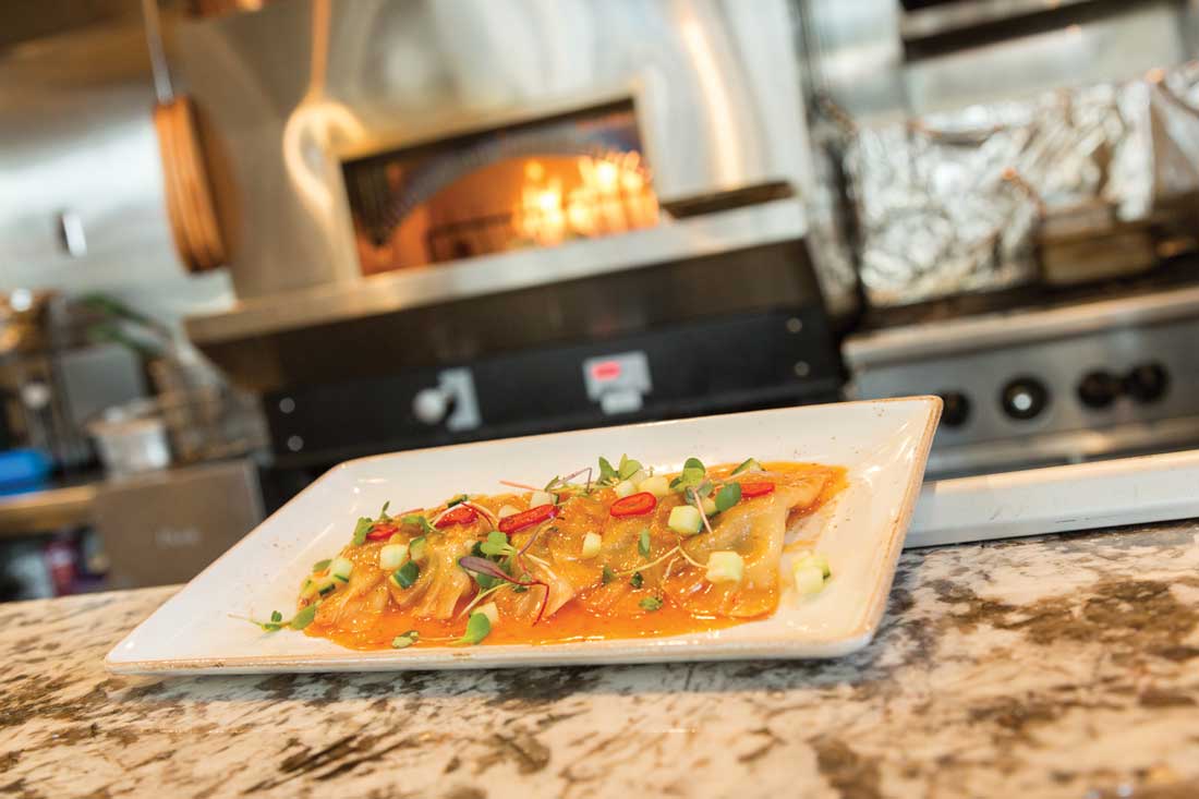 Five dainty pot stickers brimming with lobster and shrimp floated in tangy citrus sauce, topped by slivers of Fresno peppers. The sweet-sour sauce accented the shellfish beautifully, and the shaved Fresnos added a kick. A surprisingly generous amount of lobster and shrimp was stuffed inside each dumpling. By comparison, the Brussels sprouts salad was bland, despite gobs of fresh parmesan cheese and a coating of tart balsamic reduction in the mix.
