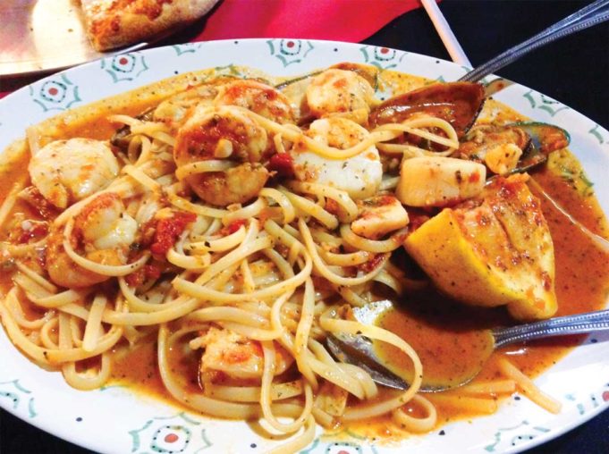There’s more seafood than pasta in Luigi’s shrimp scallopini. Not that anyone’s complaining. Photo by Anthony Mariani.