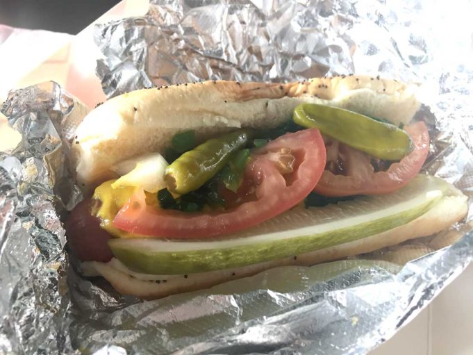 On a recent visit, my guest and I walked in with two goals: try the Chicago dog and the New York pizza. Though the hot dog comes in many forms with a variety of sausages, the friendly guy at the counter suggested I stay traditional. (He actually used the word “pure.”)