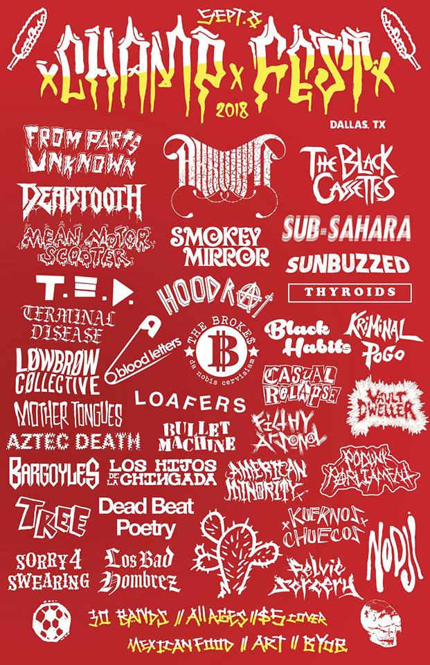 1) There’s this thing in Dallas called Champ Fest 2018 (El Festivo Del Barrio) that starts at noon, has a $5 cover, is 21+/BYOB, and features 30 fucking bands across two stages, plus Mexican food. I’m not gonna list all of them, but some of them are: LOAFERS, the Thyroids, Sub-Sahara, Sunbuzzed, Mean Motor Scooter, Akkolyte, Vault Dweller, and the Ellen Degenerates. As you may have surmised, this is a punk heavy event. Sounds hella fun to me! The address is 2027 Conner Dr, Dallas, TX 75217. Aztec Death is also playing, so here’s one of their songs, in YouTube form: https://www.youtube.com/watch?v=x2HdNgfp_2E