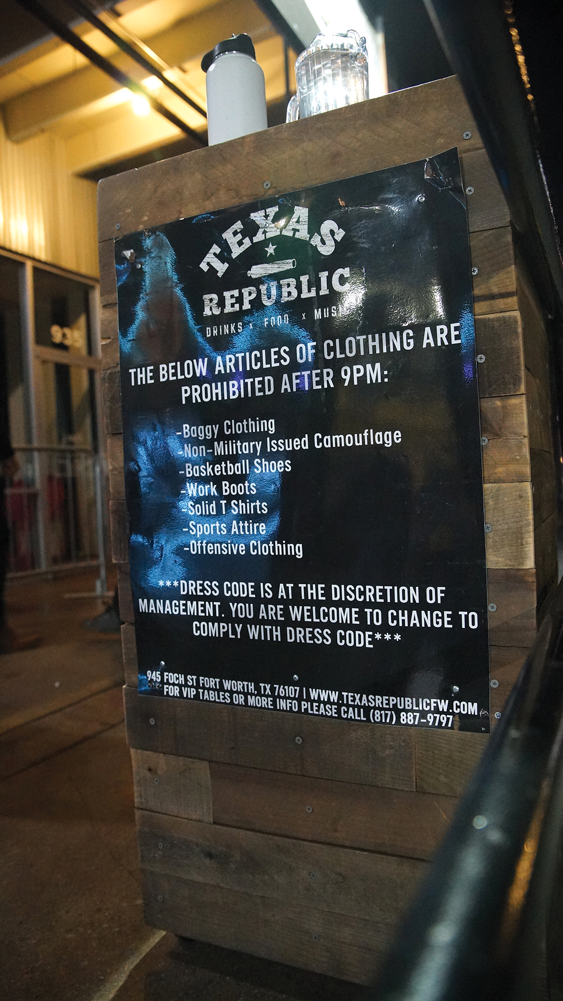 Texas Republic owner Sam Sameni said the “concise, clear” dress code is posted in a highly visible part of the building and is enforced equally. Baggy clothing, non-military issued camouflage, Air Jordans, Air Force Ones, Polo boots, Timberlands, solid T-shirts, sports attire, and offensive clothing are prohibited after 9 p.m.