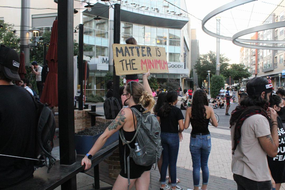 The protesters then marched to Concrete Cowboy Bar and The Social House, which both locked out protesters. As they chanted, “Black lives matter” at barricaded staff and patrons, marchers plastered nearby walls with flyers. Mash’d was soon flooded with dozens of boisterous Black Lives Matter activists who shouted, “Whose streets? Our streets!” inside the confined restaurant. Nearby In-N-Out Burger was similarly infiltrated before the march returned to Montgomery Plaza for one final rally.