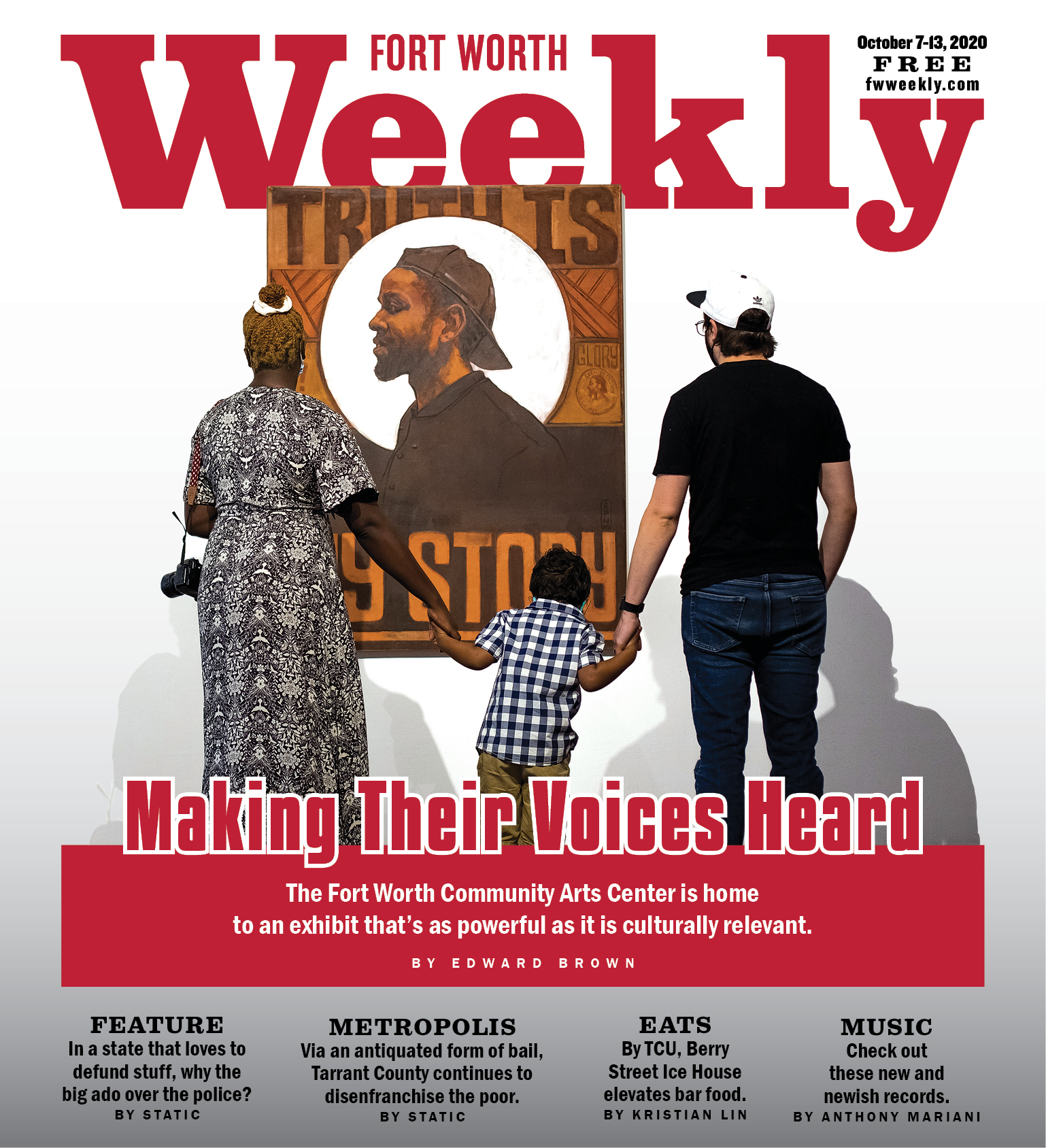Our Faces, Our Voices, showing at the Fort Worth Community Arts Center through Saturday, Nov. 7, is the most recent addition to a line of artist responses to police shootings and a president whose tweets and public statements too-frequently give comfort to white supremacists. The self-portraits by 15 minority artists tell 15 stories through honest and visually captivating means.