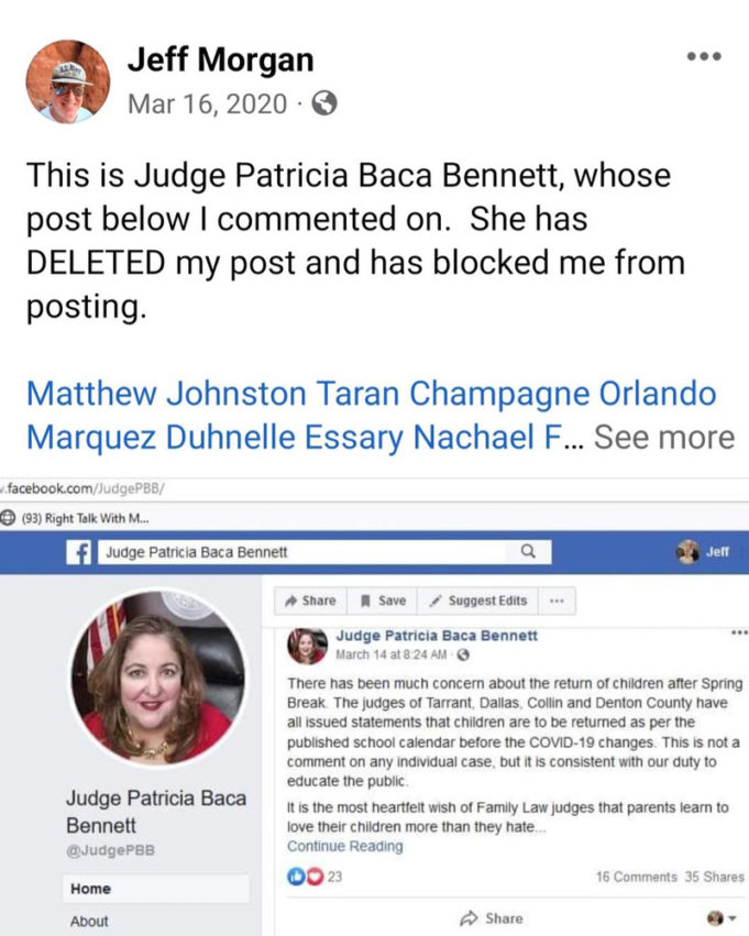 Our contemptible family-court judges are also blocking constituents, and they’re not the only ones. Local YouTuber Cody Highroller alleges Fort Worth Mayor Mattie Parker blocked him from her public profile, and earlier this year, the Tarrant County District Attorney’s office cut off public comments across three social media platforms: Facebook, X, and Instagram.