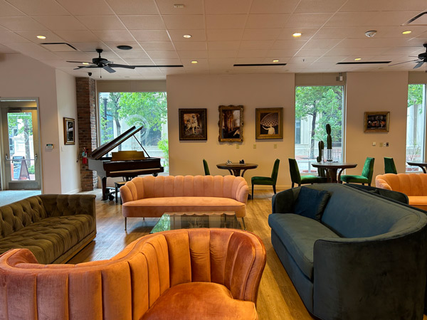 The 8,000-square-foot space at 3rd and Lamar streets still feels just as vast and open, with its incredible windows and tall ceilings. As you enter, the plush velvet lounge seating in teal, blush, and emerald that once dotted the far end of the main dining area now sits front and center. The piano, too, has taken up residence by the door, alongside three small wooden tables with chess and checkers. Artwork depicting French scenes now hangs on the walls, but the same dark wood tables and leather chairs line the windows along Lamar, with the addition of some bistro-style chairs.