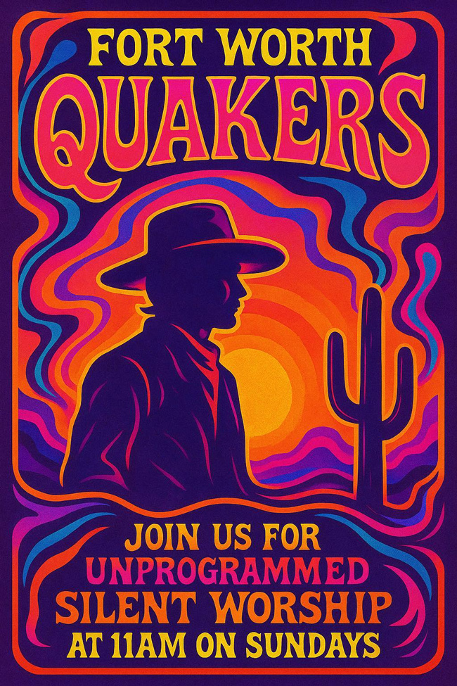 Local Quakers meet at Broadway Baptist Church (305 W Broadway, Room 302, Fort Worth) every Sunday at 11am, and the public is invited to these Fort Worth Friends Meetings to join the conversation. To find them, enter the main church entrance, follow the signs or rainbow banners, and take the elevator to the 3rd floor. They hold a silent worship period for the first hour, followed by a second hour of activities, such as discussions and potluck meals.