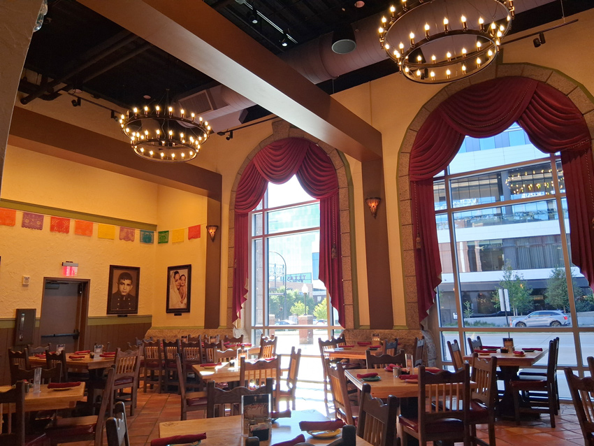 Inside, the restaurant is much roomier than expected for such a packed entertainment district. Bold colors line the walls to the back where the booths sit, and vibrant art hangs on the wall. The windowed area allows for a lot of light, which is nice. The ornate chandeliers reminded me of old Europe, which brought about some confusion. Expecting Mexican decor, we noticed a blend of Europe, Mexico, and Tex-Mex-like themes.
