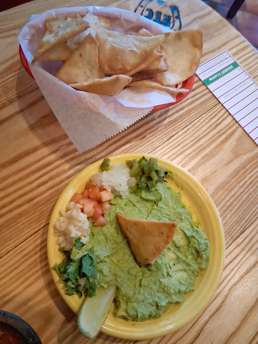 I thought a great follow-up would be the guacamole. Interestingly, it came on a plate disassembled, the avocado, onion, cilantro, and chopped garlic all on the plate unmixed. I’ve never actually seen that at a restaurant. But we jumped in and blended it together ourselves. Maybe El Tiempo should give some instructions because mixing the quantities on the plate meant there was an abundance of garlic breath afterward. The dish was served with fried flour tortilla chips instead of corn or pita, which was new. Like buňuelos, minus the sugar. They were actually pretty good.