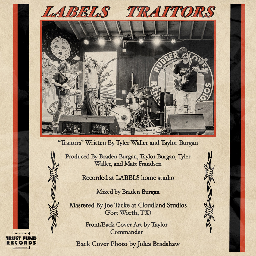 A mere four months after they dropped their excellent, blistering album White Hot, Mid-Cities psyche-punk Labels have a new single out on Nov. 1. “Traitors,” co-written by drummer Taylor Burgan and singer Tyler Waller and produced by guitarist Braden Burgan at the band’s home studio, is a furious refutation of America’s slide into fascism, in which the Burgan brothers’ angsty, anxious beats and distorted blasts carry Waller’s wide-eyed rage like a crowd carrying an upside-down flag set on fire. Frankly, this is the kind of song more bands ought to be writing, though good luck sounding this pissed.