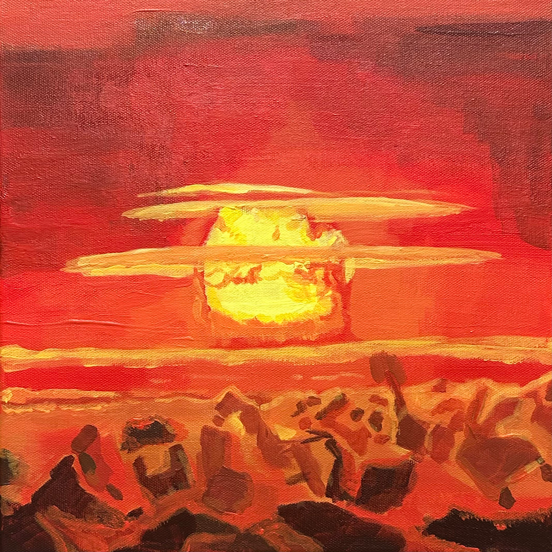 Since we’re on the subject of Clint Niosi, he released a new single last week. “Destroyer of Worlds” is a haunting, smoldering rumination on humanity’s gravitation toward self-destruction, viewed through the lens of nuclear proliferation. Singing “I am become death, destroyer of worlds” in the choruses, Niosi’s baritone balances a tone between cynicism and bemusement, like if “Cat People”-era David Bowie were somehow able to read the headlines of the 2020s. Backed by Haskell, plust multi-instrumentalist Claire Hecko on viola, violinist Tamara Cauble Brown, drummer Eddie Dunlap, and saxophonist David Williams, Niosi conjures a spacious, last-night-on-earth ambience for what I’d call “dread-signation,” a sort of doleful acceptance of a truly baffling scenario — that humans will always fight fire with fire until nothing but ashes and dust remain.