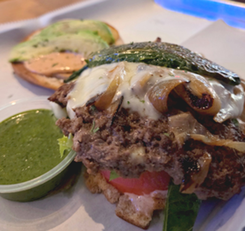 My husband ordered the Bleu Cow Burger, an 8-ounce patty stuffed with savory bleu cheese, topped with crispy bacon and a tangy house sauce, while I opted for the California Burger, a 5-ounce patty smothered in white cheddar cheese, with chipotle mayo, fire-roasted jalapeños, caramelized onions, and sliced avocado. I guess the avocado is what gives it its moniker. My burger also came with a side of salsa verde, which I immediately slathered on to the burger. The bright green, cilantro-forward sauce also made a great condiment to dip fries into.