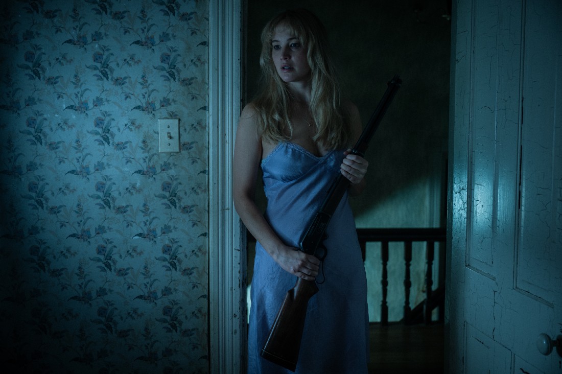 Lawrence portrays Grace, an aspiring novelist and new mother who is creatively blocked and suffering from postpartum depression that’s shading over into postpartum psychosis. Her husband Jackson (Robert Pattinson) has moved the family into his uncle’s house in the country after his uncle committed suicide there in a particularly gruesome way. Jackson’s mysterious job takes him out of town for four days each week, leaving Grace alone to parent the baby boy, whom the couple hasn’t named yet.