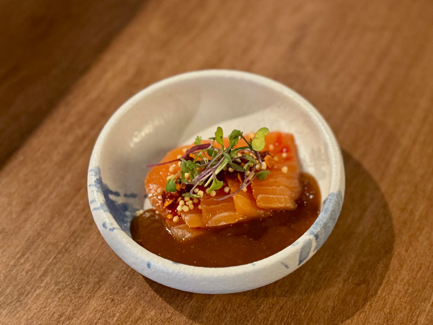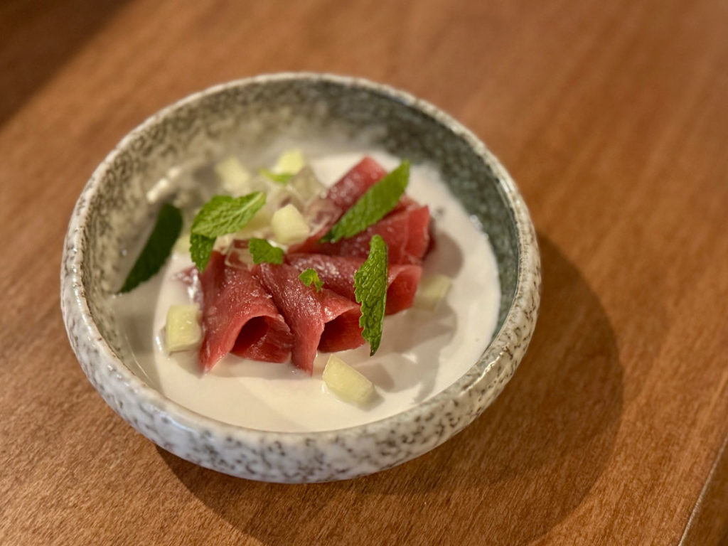 The slightly sweet rice-based alcohol paired well with the Bluefin tuna crudo surrounded by vinegary coconut zu (juice) and topped with coconut jelly and honeydew squares along with mint leaves for an uplifting pop. White truffle oil and sesame miso sauce blended well when scooped with a slice of silky salmon crudo covered with a crispy rice cracker known as bubu arare for contrast. The sweet-and-sour onion pear zu joined well with the relish and crackling kataifi (traditional Middle Eastern dough), which brightly complemented the slivers of snapper crudo.