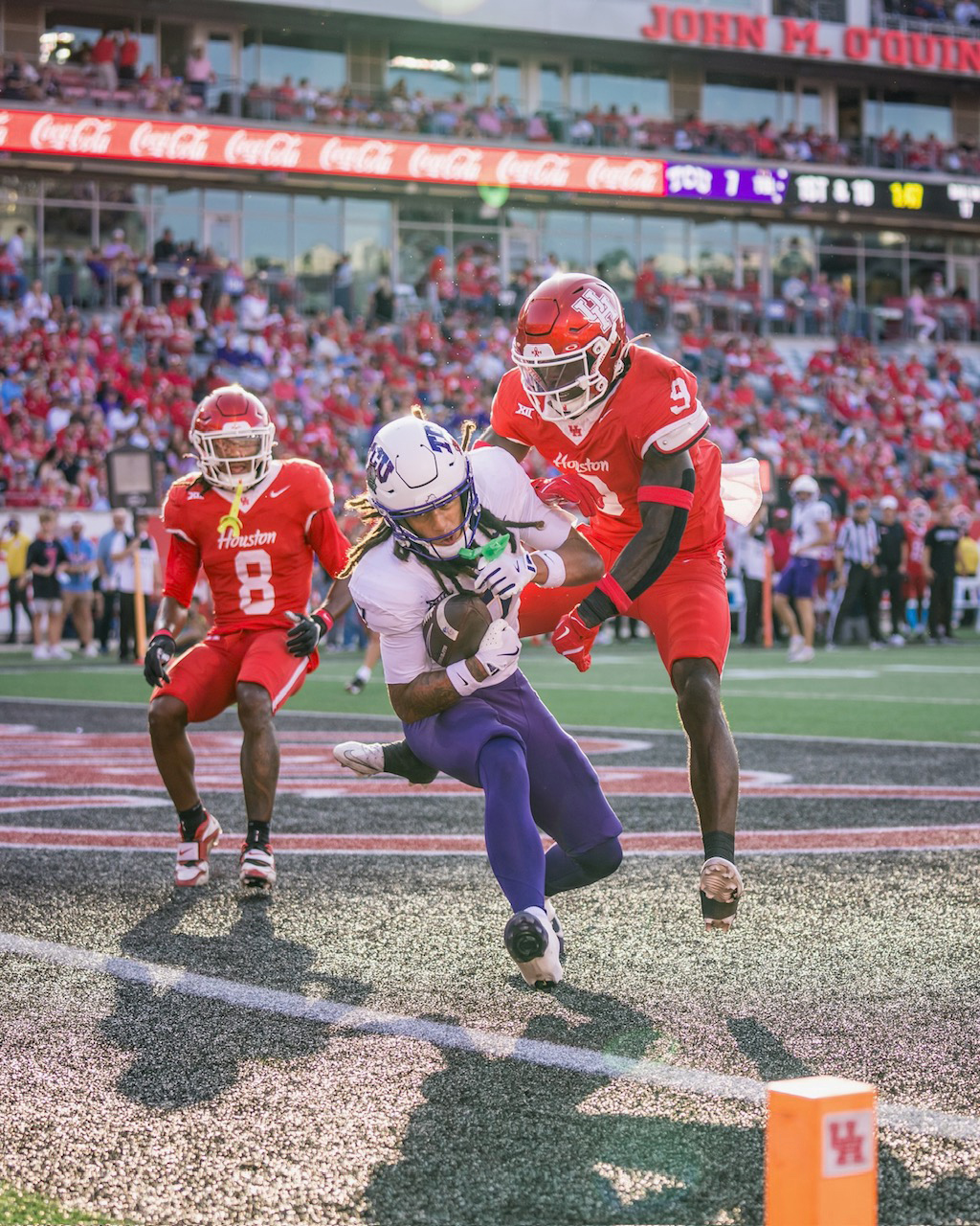 Usually, when a team turns the ball over four times, they don’t win the game, especially when they’re facing a ranked opponent with a better record on the road. That was not the case on Saturday, as the TCU defense continually found answers against the Cougars to overcome Hoover’s three interceptions and a lost fumble by running back Jordyn Bailey (#4). An extremely timely interception by Julius Simms (#31) in his own endzone proved to be pivotal in surviving a tight game where the difference was two missed field goals by the Cougars, including a manageable 38-yarder that would have tied the game with only seconds remaining. Jeremy Payne (#26) stepped up as the leading rusher, accumulating 103 yards on 18 carries, and probably would have been the better choice on the fourth-and-short that would have iced the game but instead gave way to a 74-yard drive with less than two minutes remaining.