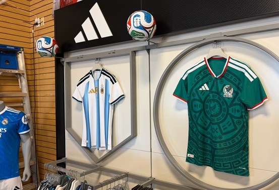In particular, Mexico and USA gear abounds in a number of locations. At Soccer City in Arlington, they told me they generally stock the Top 10 or so countries, with the likes of Spain, Germany, and Brazil on the shelves. Soccer Post (previously the Soccer Corner) in the Arlington Highlands has the kits that adidas has released so far. They’ve also got the official FIFA World Cup caps. The nearby Academy Sports + Outdoors has a big World Cup display right in the front of the store, even in the middle of (gridiron) football season, with prominent Messi/Argentina branding and other countries represented as well.