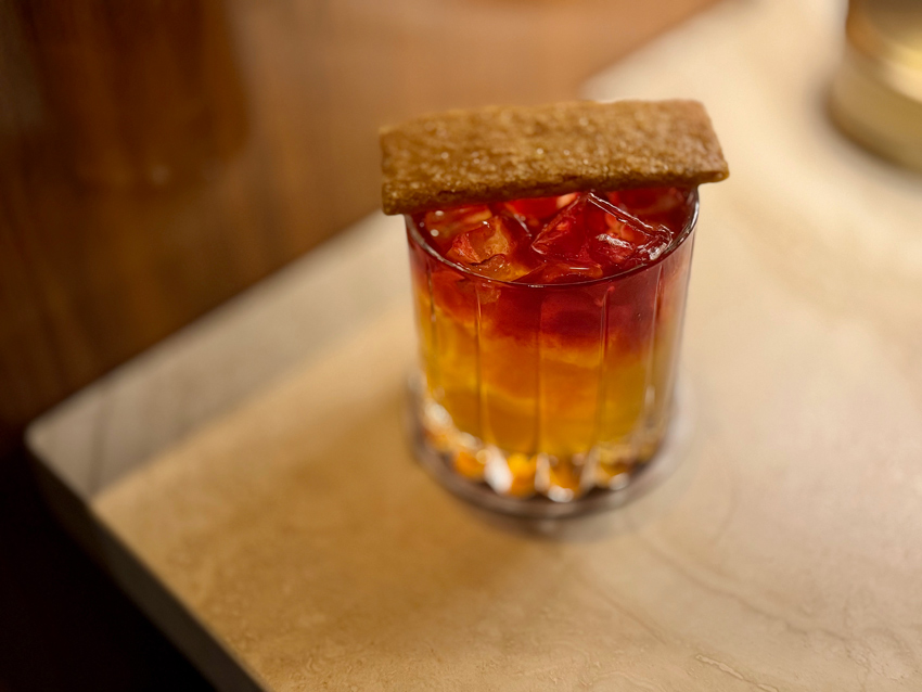 My guest and I were greeted with an engaging green curry bisque as our cocktails were placed on the table, a Moscow mule for my guest and an Autumn twist on an Old Fashioned for me. The Pear in the Woods (TX Bourbon, spiced pear, lemon, port, black walnut bitters) was delightfully topped with a graham cracker.