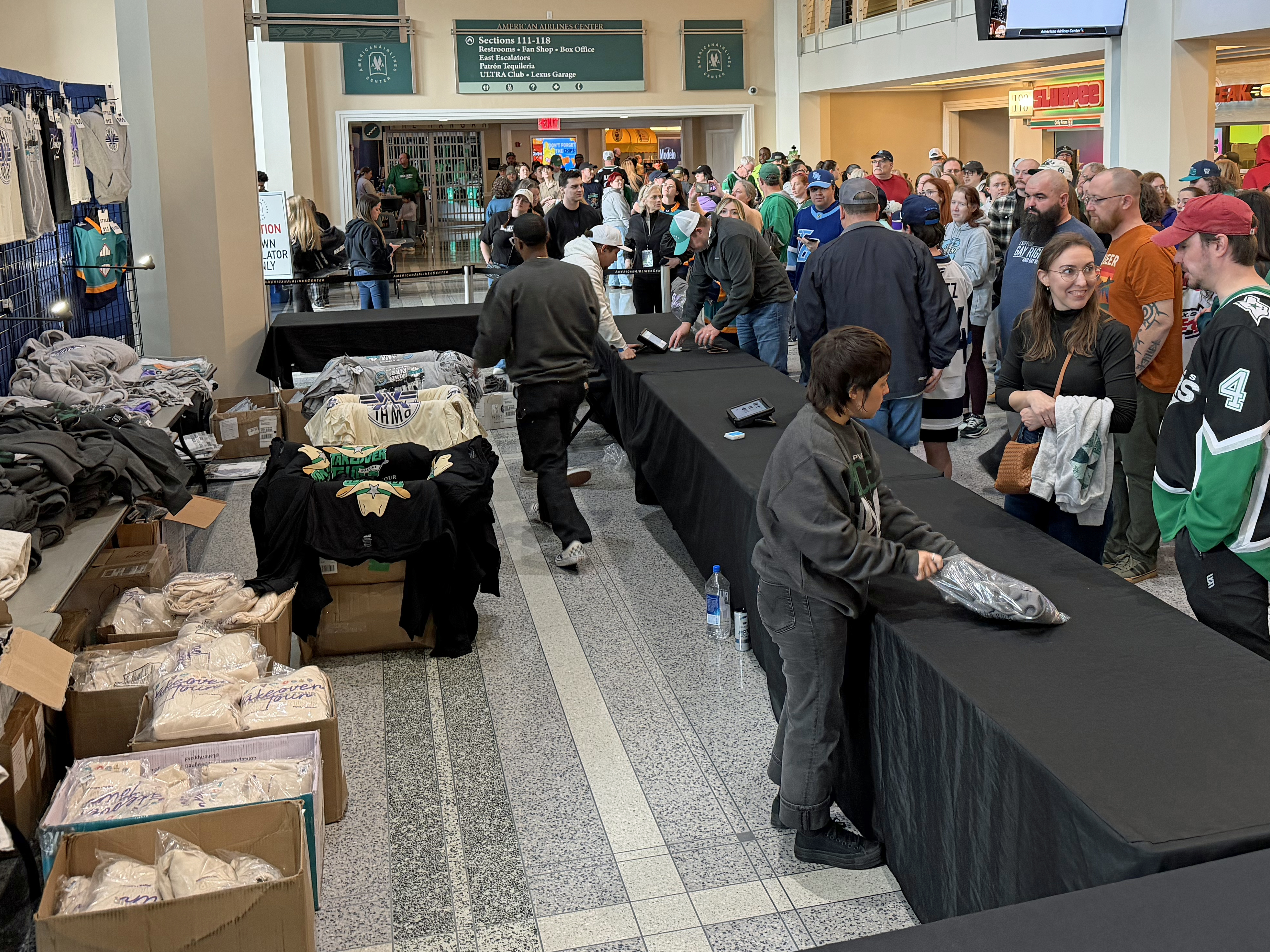 The league operated two merchandise stands on the AAC’s lower concourse. Each had a line of prospective customers that stretched the length of it lobby before the game. Any league would be pleased to see such commercially-manifested enthusiasm for its product. And we did see a number of fans already clad in PWHL gear, including for teams beyond the two participants. But we also saw a ton of other pro hockey teams represented. We spotted New York Rangers, Detroit Red Wings, and San Jose Sharks sweaters, plus many attendees in Stars jerseys. We considered that an encouraging sign for women’s hockey, because it said to us that those people considered this game a legitimate part of their hockey fandom.