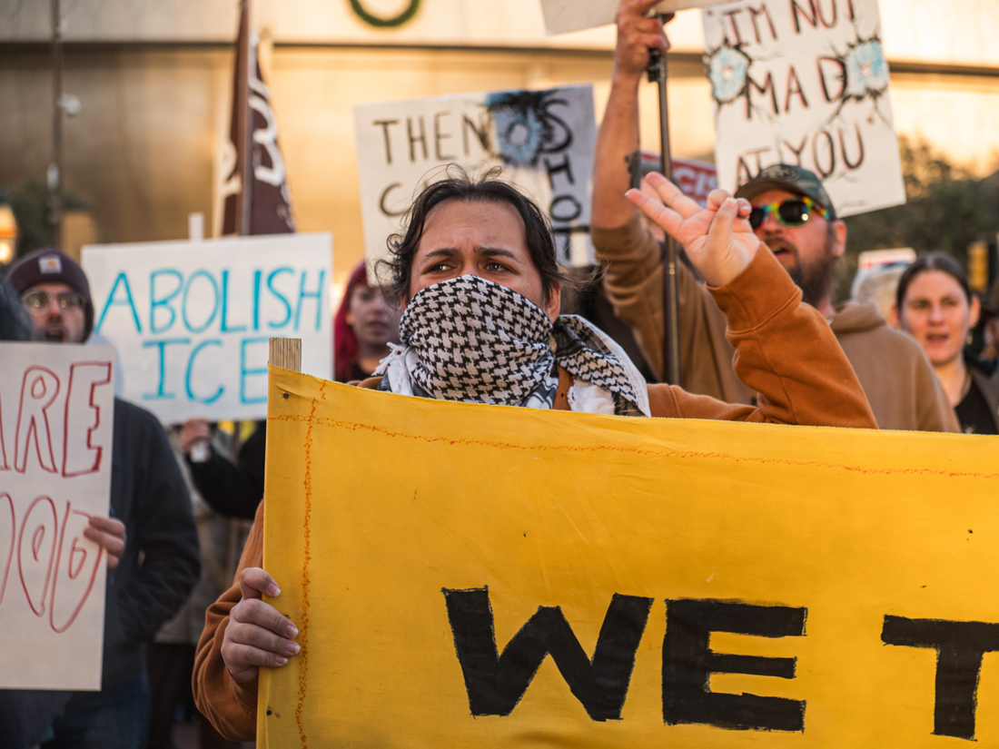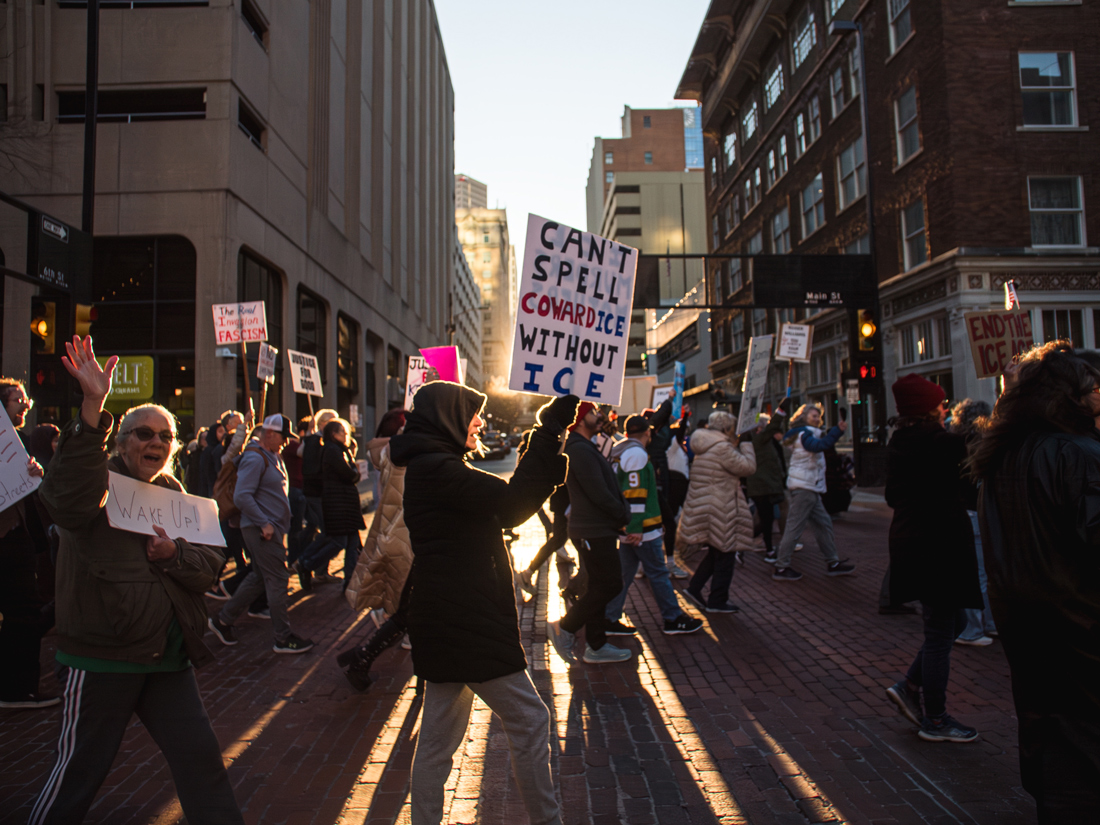 Picket signs calling for ICE to be abolished, demanding justice for Renee Good, and reminding everyone of Donald Trump’s ties to Jeffery Epstein filled Main Street as the crowd provided a steady chant of “Fuck ICE.”