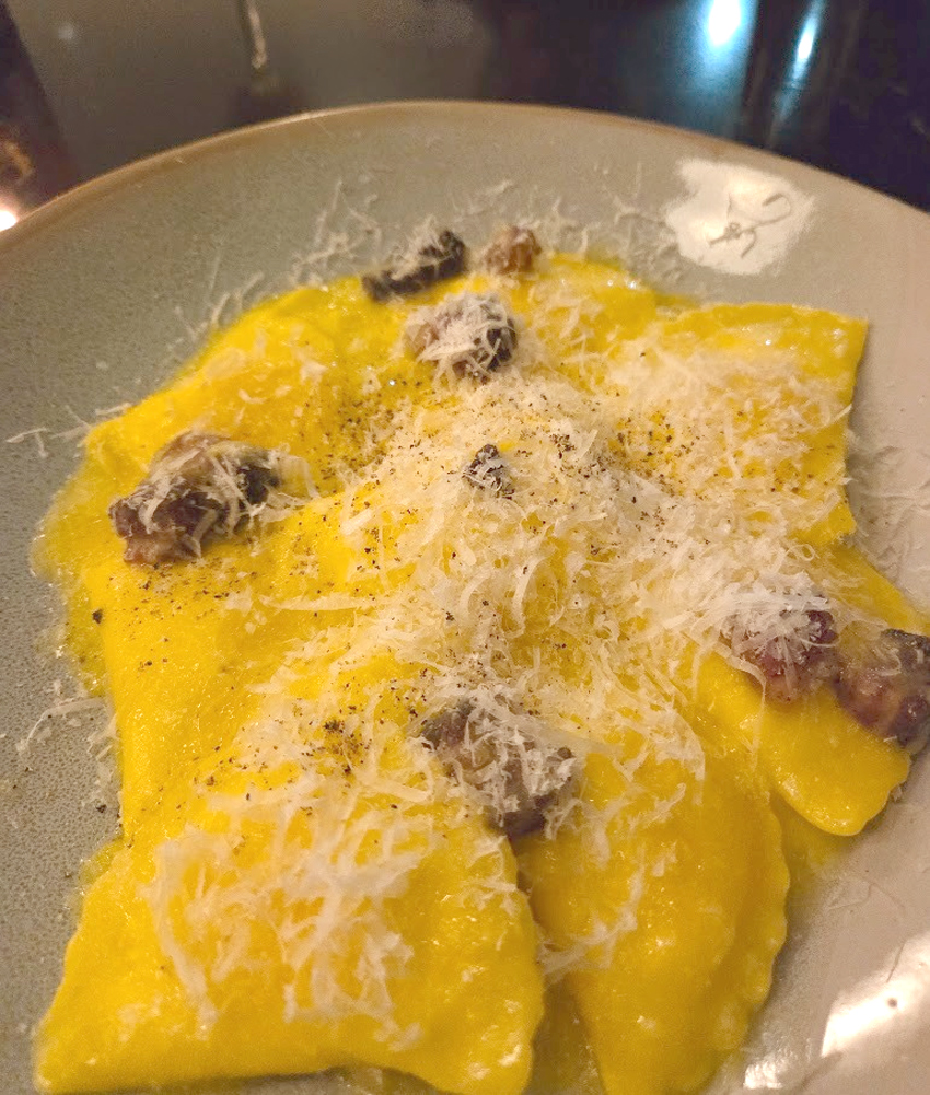Served with tender morsels of guanciale, the homemade mezzaluna pasta was tender and delectable. Photo by Emmy Smith