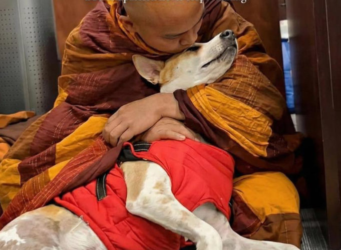 Yes, indeed, the boys are back in town. A group of Buddhist monks has been on a 15-week Walk for Peace from their home in Fort Worth to Washington, D.C. Along with their famous rescue dog mascot, they will return home today. They were already wildly popular, but little Aloka needed veterinary surgery along the way due to a leg injury. Images of him being carried and riding in a cart during recovery made the group a viral sensation and symbol of compassion. The stinking-cute heart-shaped mark on his head probably didn’t hurt either.
