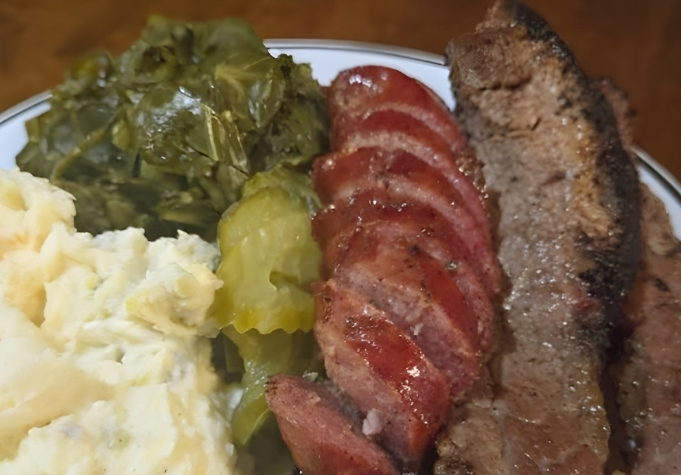 Big Will’s started as a barbecue food truck that regularly made the rounds at area school events. I opted to stick with familiar barbecue favorites, ordering a two-meat plate of sliced brisket and sausage, with potato salad and collard greens. My husband picked fried chicken, mac ’n’ cheese, and green beans from the soul food side of the menu.