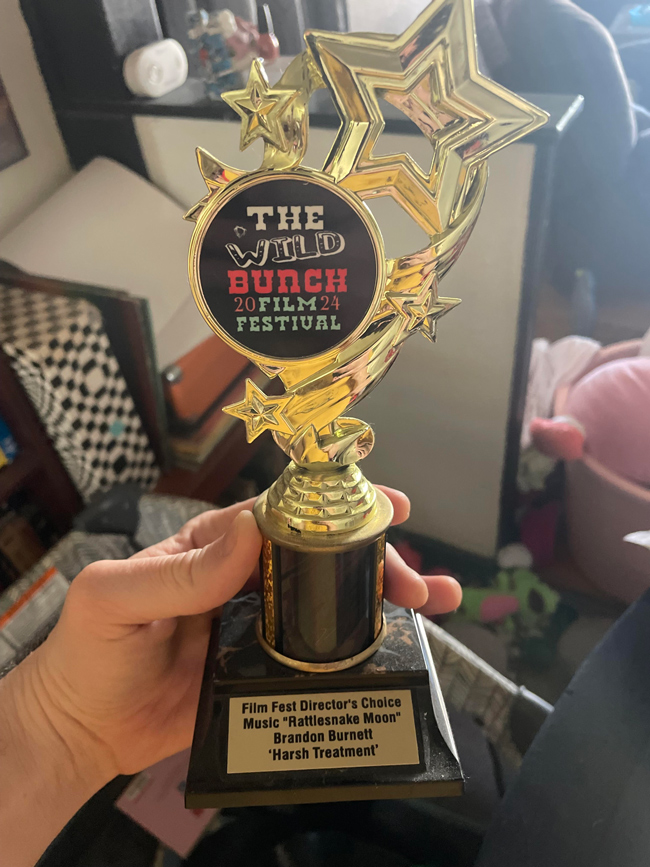 After a show at Dan’s Silverleaf in Denton three years ago, country-noir singer-songwriter Brandon “Broke String” Burnett happened to meet two multimedia producers. Datalus Pictures’ Marielena Resendiz and Johnathan Paul asked him to record a song for their 2025 indie Western. Burnett and his group excitedly went to work, and their track “Rattlesnake Moon” not only appeared in Harsh Treatment but won an award for best original song at a Tucson, Arizona, film festival in 2024.