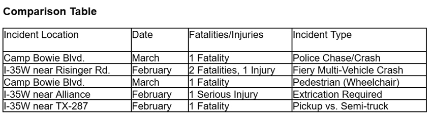 Safety Measures: The key safety measures under discussion include: Increased and more visible police patrols in crash-prone hotspots; Road “diet” studies for Camp Bowie to calm traffic and add protected pedestrian crossings; Installation of median barriers on high-speed sections of I-35W to prevent crossover collisions; Reviewing and potentially revising police pursuit policies for non-violent offenses; and Public awareness campaigns targeting the dangers of speeding and the high cost of distracted driving.