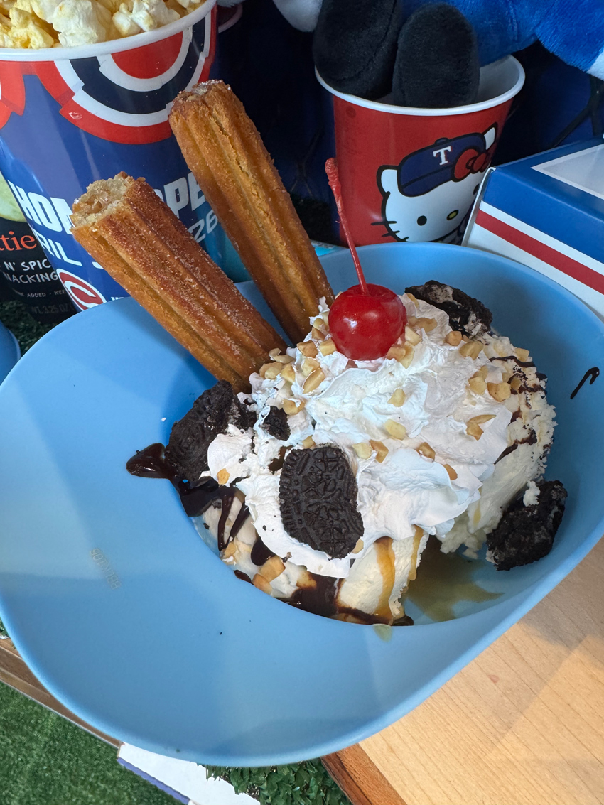 For those wanting sweets instead of meat in their souvenir helmet, there is the Churro Helmet Sundae, filled with scoops of Blue Bell ice cream, warm churros, and classic sundae toppings.