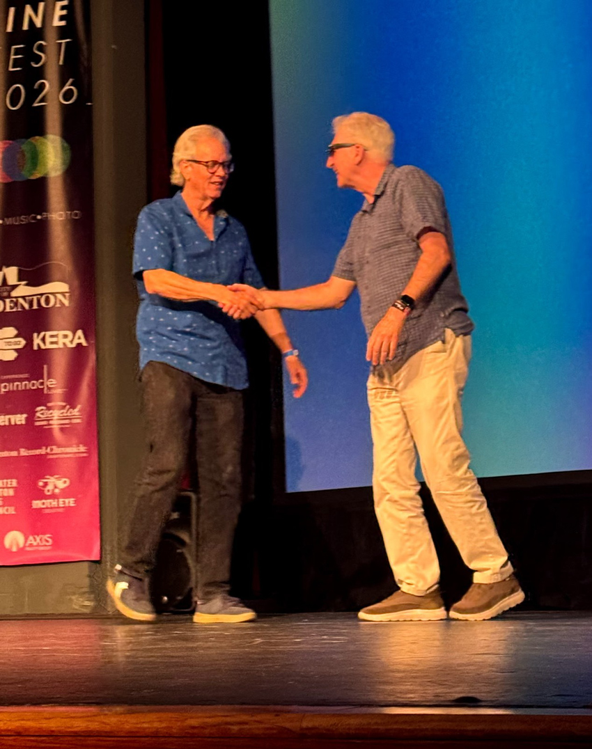 (From left) Jeff Prince greets film director Oren Jacoby in March during a post-screening Q&A session at a film festival in Denton.