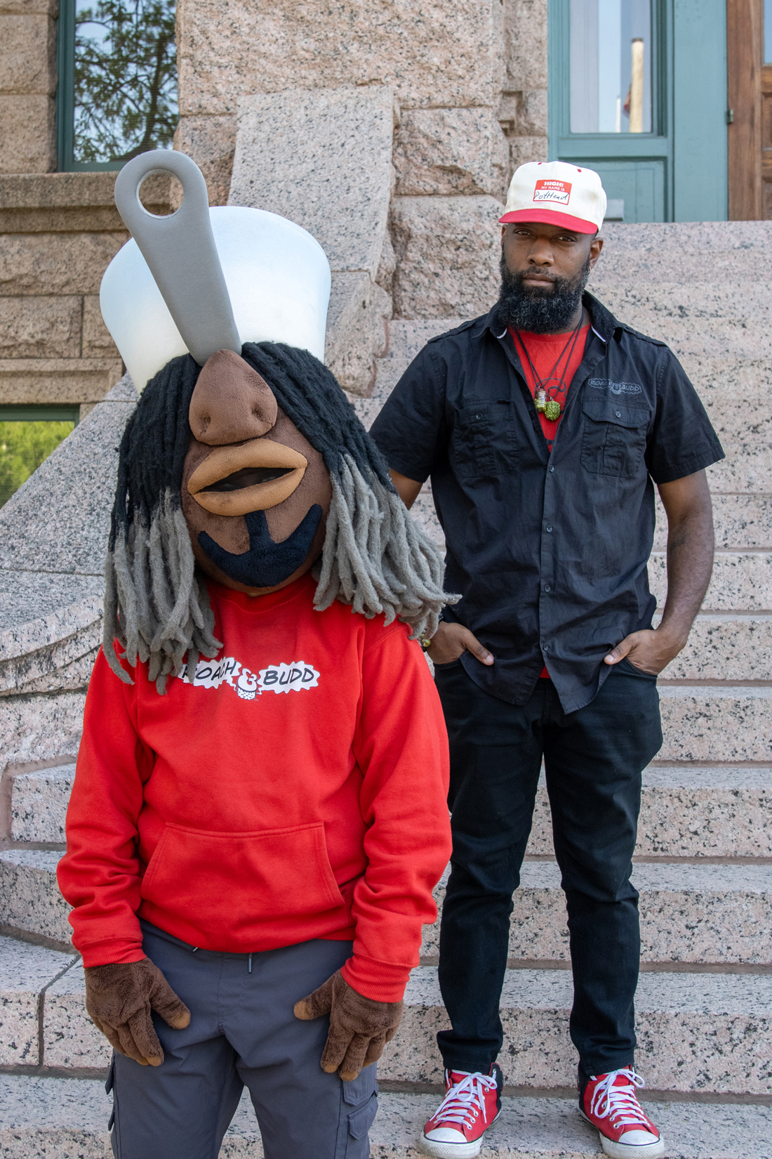 Troy Mack and his character Pothead on the steps of the Tarrant County Courthouse: “It definitely hits home. It hurts Texans. There’s businesses we work with on a day-to-day basis, and I hate to see them have to close down. You’re not just shutting down work but also that connection to the community that we’re trying to build.”